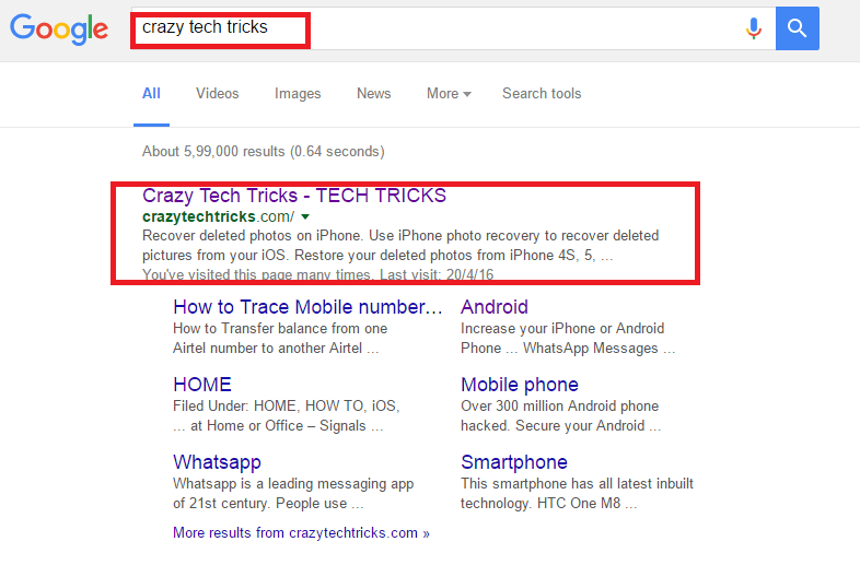 • Then, tap on the main link showing your websiteVisit your website from search engine
